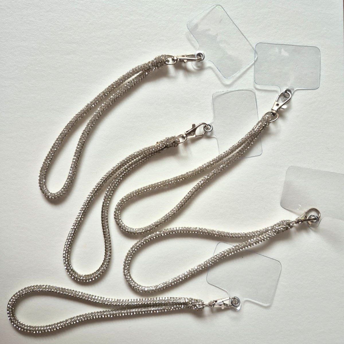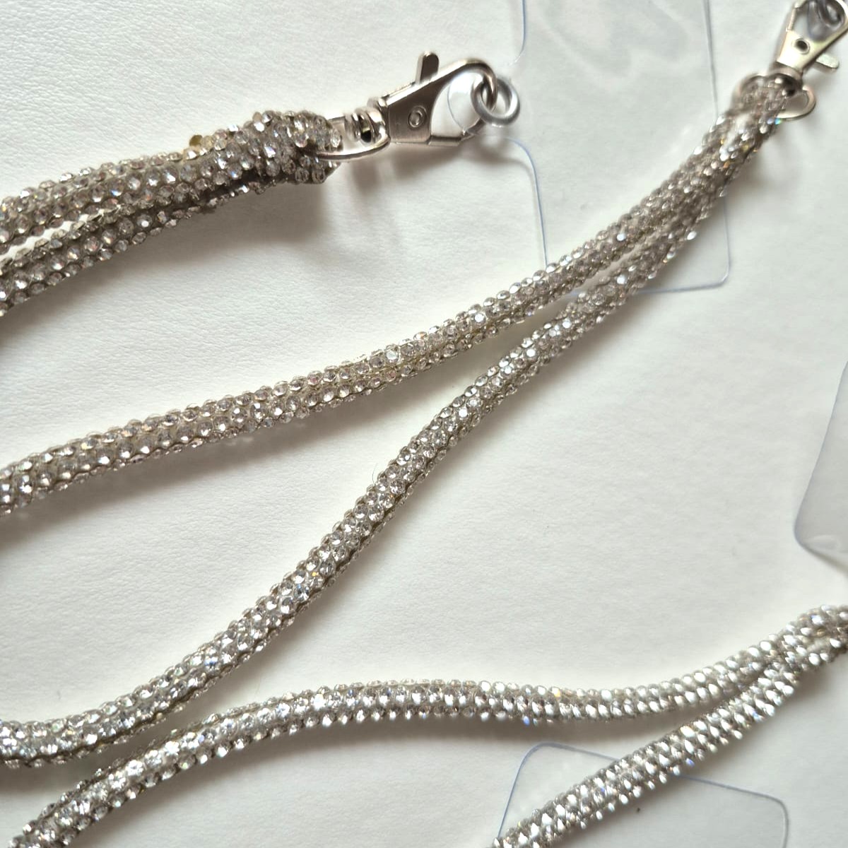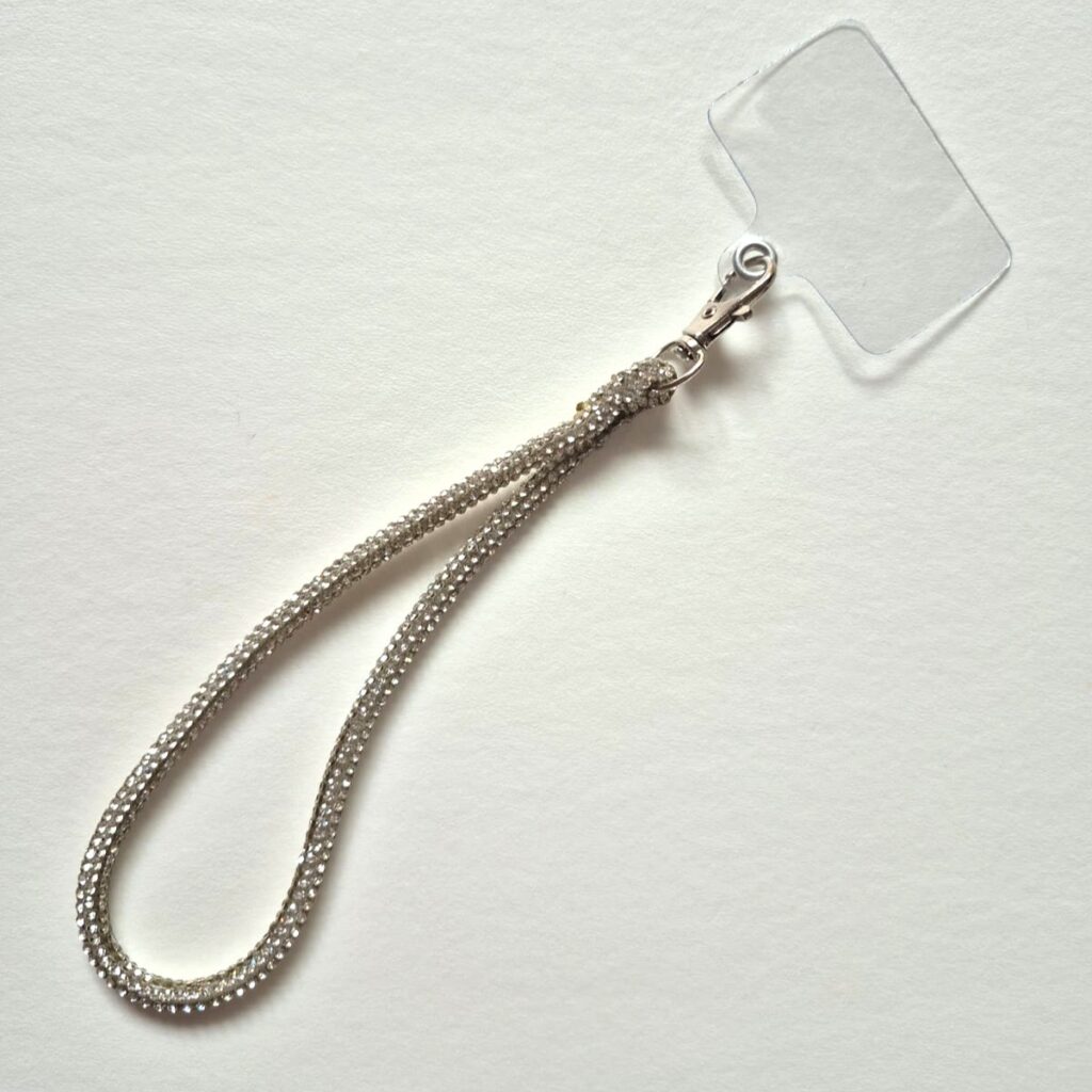La correa corta de strass es ideal para llevar el celular en la muñeca o sumarle ese detalle que levanta todo el look. Es cómoda, segura y tiene el mismo brillo intenso que la versión larga… pero en formato compacto.